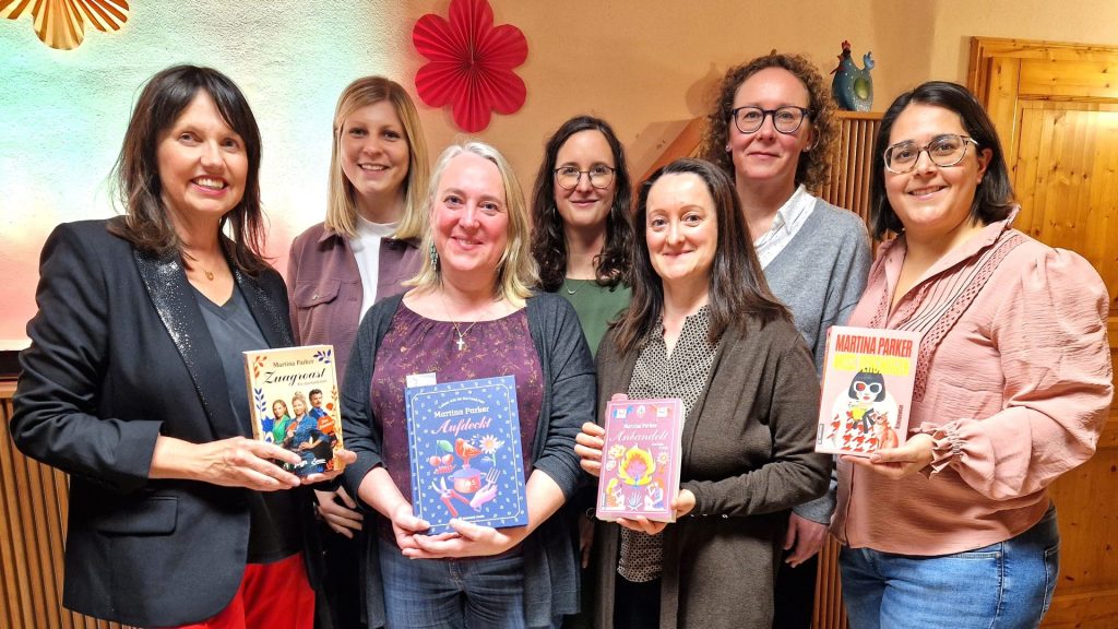 Krimiautorin Martina Parker (links) mit den Damen der Bibliothek Sallingberg v.l.: Cornelia Binder, Magdalena Allinger, Sonja Tiefenbacher, Karin Höld, Marie Niefergall und Sarah Ahmadi-Erber.